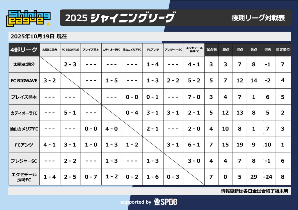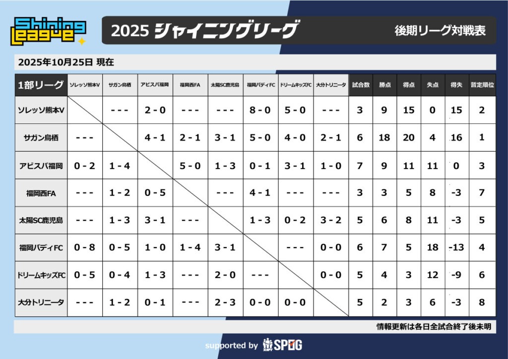 後期:【公式】2025シャイニングリーグU-12 2025.10.26 Post Share Hatena Pocket RSS feedly Pin it TOP 後期 1部 2部 3部 4部 前期 ※ 万全の情報提供を喫する為、大会及び出場チーム関係者以外の方の試合結果等の無断引用・転載(URLによるリンク以外)はご遠慮下さいますようお願い致します。 後期リーグ 1部リーグ リーグ対戦表の拡大試合結果詳細はこちら 2部リーグ リーグ対戦表の拡大試合結果詳細はこちら 3部リーグ リーグ対戦表の拡大試合結果詳細はこちら 4部リーグ リーグ対戦表の拡大試合結果詳細はこちら TOP 後期 1部 2部 3部 4部 前期 Post Share Hatena Pocket RSS feedly Pin it 後期|4部リーグ:【公式】2025シャイニングリーグU-12 後期|2部リーグ:【公式】2025シャイニングリーグU-12 関連記事一覧 2019 後期順位別リーグ【公式】シャイニングリーグU-12 2019.09.23 前期|4部リーグ:【公式】2023シャイニングリーグU-12 2023.08.19 Group B:2021前期順位パート決定L:【公式】シャイニ... 2021.10.14 後期:【公式】2024シャイニングリーグU-12 2025.01.11 前期|2部リーグ:【公式】2025シャイニングリーグU-12 2025.07.25 4位グループ:2019 後期順位別L【公式】シャイニングリ... 2019.09.23 下位グループ:2021 後期順位別L:【公式】シャイニン... 2021.10.14 試合模様|後期順位別リーグ:【公式】2022シャイニン... 2022.10.02