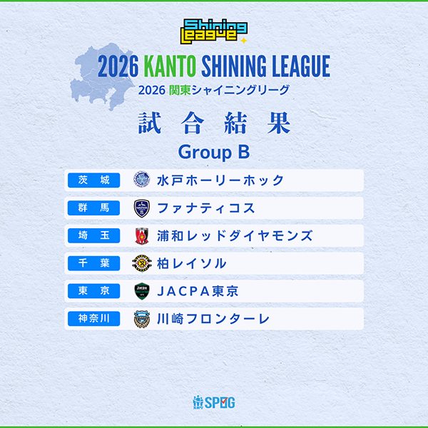 前期:【公式】2026 関東シャイニングリーグU-12 2026.03.28 Post Share Hatena LINE RSS feedly Pin it note ※ 万全の情報提供を期するため、大会及び出場チーム関係者以外の方による試合結果等の無断引用・転載(URLによるリンクを除く)はご遠慮くださいますようお願いいたします。 前期リーグ グループA 試合結果詳細はこちら グループB 試合結果詳細はこちら グループC 試合結果詳細はこちら 【2026】関東シャイニングリーグ, 新規設立リーグ, 関東シャイニングリーグ 前期|グループB:【公式】2026 関東シャイニングリーグU-12 前期|グループA:【公式】2026 関東シャイニングリーグU-12