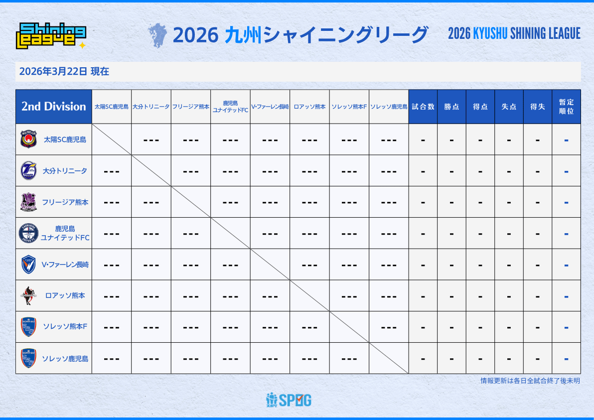 前期|2部リーグ:【公式】2026 九州シャイニングリーグU-12 2026.03.29 Post Share Hatena LINE RSS feedly Pin it note ※ 万全の情報提供を期するため、大会及び出場チーム関係者以外の方による試合結果等の無断引用・転載(URLによるリンクを除く)はご遠慮くださいますようお願いいたします。 2部リーグ 試合日程は決定次第掲載致します 【2026】九州シャイニングリーグ, 九州シャイニングリーグ, 新規設立リーグ 前期|4部リーグ:【公式】2026 九州シャイニングリーグU-12 出場チーム:【公式】2026 九州シャイニングリーグU-12 関連記事一覧 後期|1部リーグ:【公式】2025シャイニングリーグU-12 2026.03.07 大会要項・競技規則:【公式】2025シャイニングリーグU-12 2025.04.17 中位グループ:後期順位別リーグ:【公式】2022シャイ... 2023.01.22 大会要項・競技規則:【公式】2023シャイニングリーグU... 2023.01.30 出場チーム:【公式】2025 シャイニングリーグU-12 チ... 2025.02.24 前期|1部リーグ:【公式】2024シャイニングリーグU-12 2024.09.01 試合模様|参入戦進出決定T|2023シャイニングリーグU-... 2023.02.21 前期:【公式】2024シャイニングリーグU-12 2024.09.01