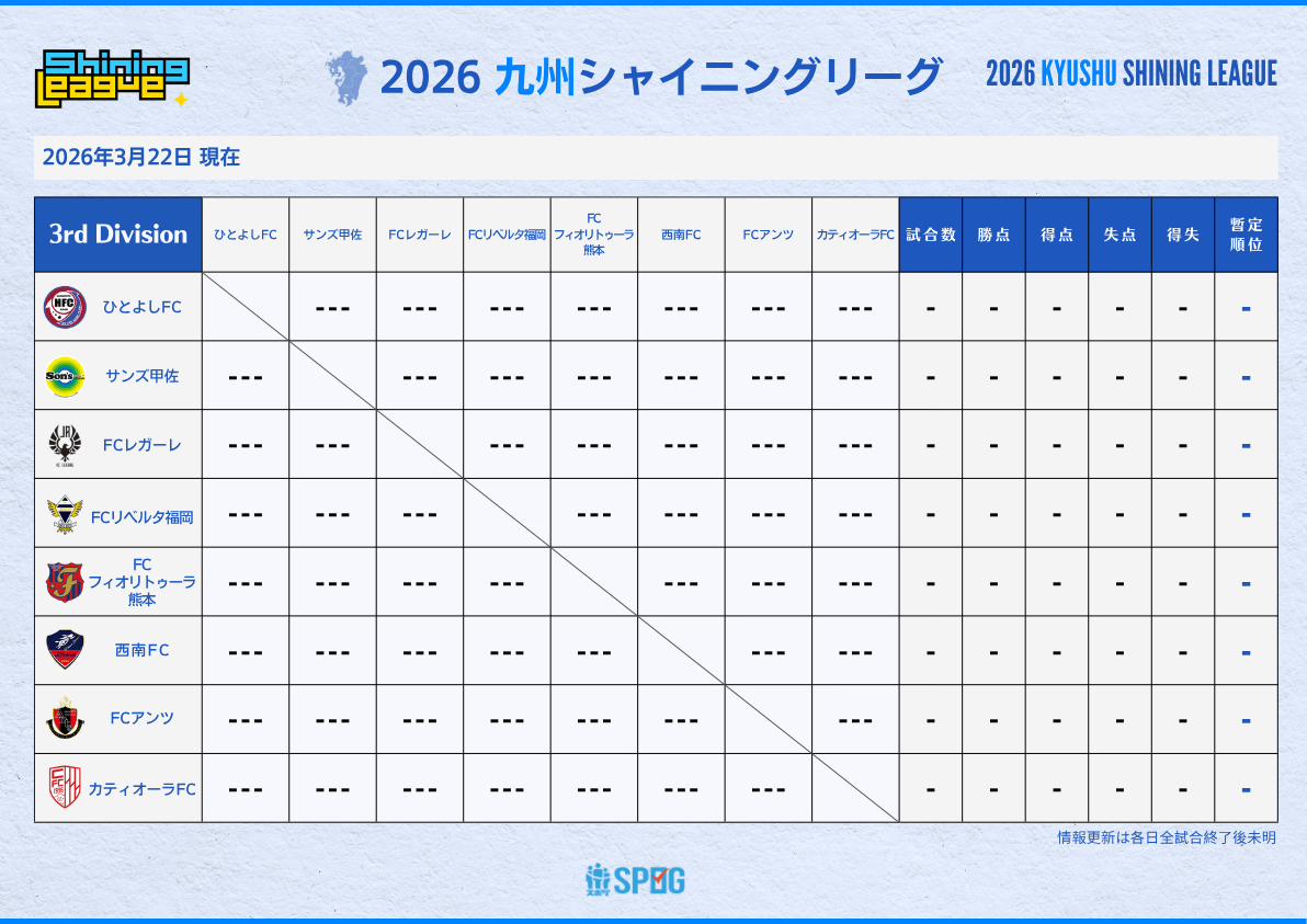前期|3部リーグ:【公式】2026 九州シャイニングリーグU-12 2026.03.29 Post Share Hatena LINE RSS feedly Pin it note ※ 万全の情報提供を期するため、大会及び出場チーム関係者以外の方による試合結果等の無断引用・転載(URLによるリンクを除く)はご遠慮くださいますようお願いいたします。 3部リーグ 試合日程は決定次第掲載致します 【2026】九州シャイニングリーグ, 九州シャイニングリーグ, 新規設立リーグ 出場チーム:【公式】2026 九州シャイニングリーグU-12 前期|1部リーグ:【公式】2026 九州シャイニングリーグU-12 関連記事一覧 2018後期順位パート決定リーグ:【公式】シャイニング... 2018.11.04 2021 前期順位パート決定L:【公式】シャイニングリー... 2021.10.14 下位グループ:後期順位別リーグ:【公式】2022シャイ... 2023.01.22 前期|4部リーグ:【公式】2023シャイニングリーグU-12 2023.08.19 大会要項・競技規則:【公式】2025 シャイニングリーグ... 2025.02.24 【公式】2019シャイニングリーグU-12 2019.07.07 前期:【公式】2024シャイニングリーグU-12 2024.09.01 出場チーム:【公式】2025 シャイニングリーグU-12 チ... 2025.02.24