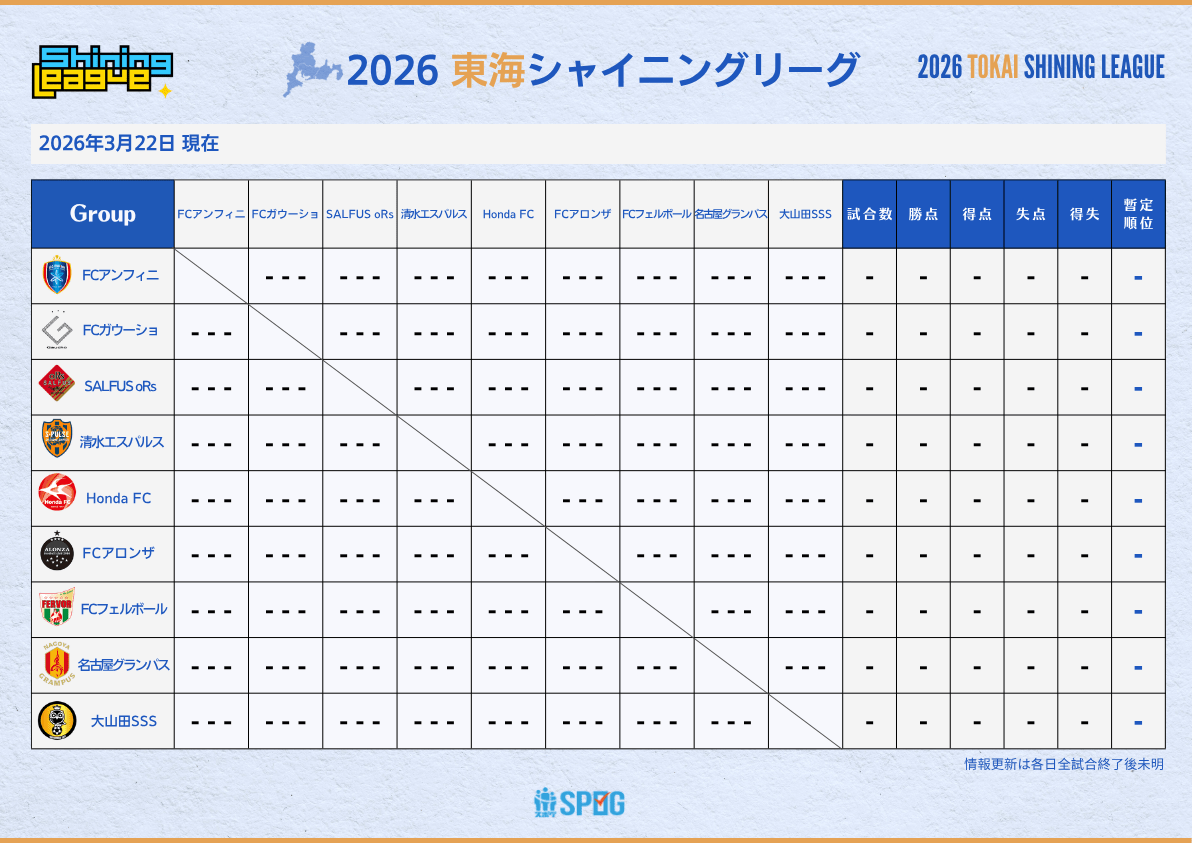 前期|グループ:【公式】2026 東海シャイニングリーグU-12 2026.03.28 Post Share Hatena LINE RSS feedly Pin it note ※ 万全の情報提供を期するため、大会及び出場チーム関係者以外の方による試合結果等の無断引用・転載(URLによるリンクを除く)はご遠慮くださいますようお願いいたします。 グループ 試合結果詳細は後日掲載致します 【2026】東海シャイニングリーグ, 東海シャイニングリーグ 出場チーム:【公式】2026 東海シャイニングリーグU-12 前期|【公式】2026 東海シャイニングリーグU-12